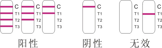 陰性:僅在控制區(C)內出現一條紫紅色條帶。在檢測區(T1)、(T2)和(T3)內均無紫紅色條帶出現。陰性結果表明:樣本中不含以上三種心肌標志物,或是三者含量均低于可檢測范圍。